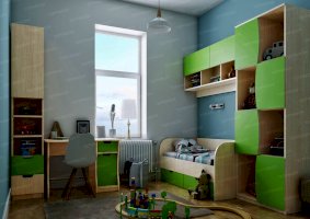 Атмосферу счастья и беззаботности приносит в дом детская «Киви». Сочетание оттенков лайм и дуб молочный выглядит очень жизнерадостно. Малышам нравится отдыхать и играть в такой комнате. Они с удовольствием спят на двух- или одноярусной кровати, хранят вещи в шкафу и на стеллажах, убирают игрушки в специальную тумбу и учат уроки за удобным письменным столом.