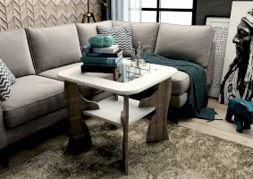 Журнальный столик №9 оригинален и элегантен. Необычным и примечательным его делают фигурные ножки нестандартной формы и прикрепленная к ним полочка, на которой можно хранить газеты, журналы и различные мелкие предметы. Очень эффектно смотрится стеклянная вставка в центральной части столешницы. Благодаря ей, а также светлым оттенкам отделки стол кажется изящным и воздушным.