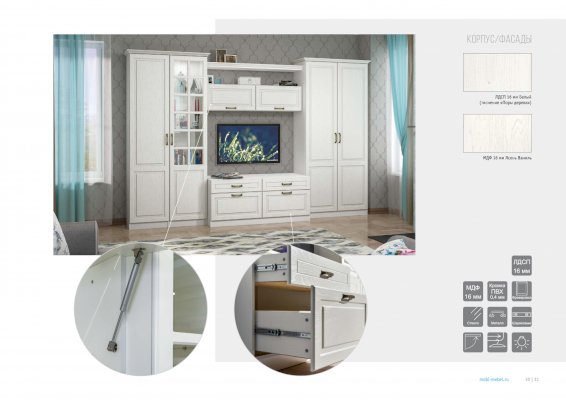 Новый Свет, знаменитый золотом и пряностями, авантюристами и первооткрывателями, обогатил мировую культуру ещё и своим особенным интерьерным стилем, воплощенным в гостиной «Ливерпуль». Сочетание лёгкой древесной структуры и светлого тёплого оттенка удачно имитируют крашеный массив. Современная фурнитура обеспечивает надёжное функционирование всех соединений. Резной карниз и броская лицевая фурнитура подчеркивают изысканность образа. Статусный вид гостиной «Ливерпуль», несомненно, не оставит равнодушными ваших гостей.