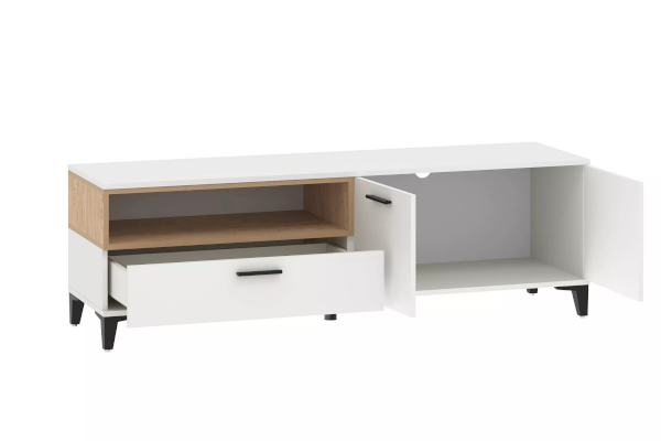 Тумба оснащена полками за распашными дверками и ящиком, который выдвигается плавно и бесшумно благодаря шариковым направляющим. Открытая ниша может быть собрана как на правую, так и на левую стороны, и в ней можно удобно расположить книги или элементы декора, а высокие опоры придают внешнюю легкость и обеспечивают быстрый и легкий доступ во время уборки.