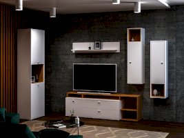 Гостиная модульная система сочетает в себе актуальные цвета и функциональную геометрическую форму с мотивами конструктивизма.