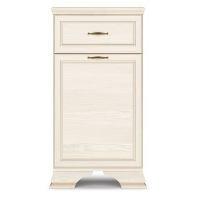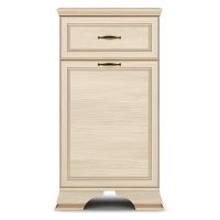 Мебель выпускается в классическом стиле с применением декоративных элементов в виде профиля, фигурных опор и золотого патинирования. В основе изделия высококачественное ЛДСП теплого оттенка «бодега белый», имеющего древесную текстуру. Лицевая фурнитура цвета «старая бронза» смотрится очень изысканно на фасадах изделия.