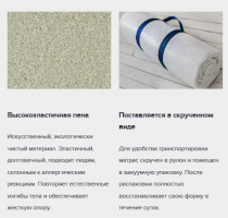 Матрас Flex Big изготовлен на основе монолитного блока из гипоаллергенного, влагоустойчивого и долговечного материала Foam благодаря высокой степени упругости обеспечивает идеальный анатомический эффект. Чехол изготавливается из хлопкового жаккарда, простеганного на синтепоне. Благодаря составу чехол хорошо пропускает воздух и сохраняет тепло. Для удобства транспортировки толстый матрас Flex Big скручен в рулон и помещен в вакуумную упаковку. После распаковки полностью восстанавливает свою форму в течение суток.