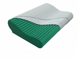 Подушка эргономической формы с двумя валиками под шею разной высоты.  Упругая основа, поддерживает голову на необходимом уровне, не позволяя «утонуть», как это может быть в чрезмерно мягких аналогах. Поверхность EcoGreen имеет особую рельефную структуру, благодаря которой, плотность материала разряжается и верхняя поверхность становится более мягкой и комфортной. Данная конструкция создает прекрасный баланс между упругостью и комфортом.