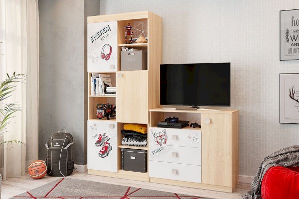 Стеллаж с открытыми и закрытыми полками идеально подойдет для книг, игрушек и мелочей. Эффектный принтерный рисунок на фасадах выдержан в общем стилистическом решении. Рисунок устойчив к истиранию и ультрафиолету. Детская «Энерджи»- все, что нужно для современного подростка!